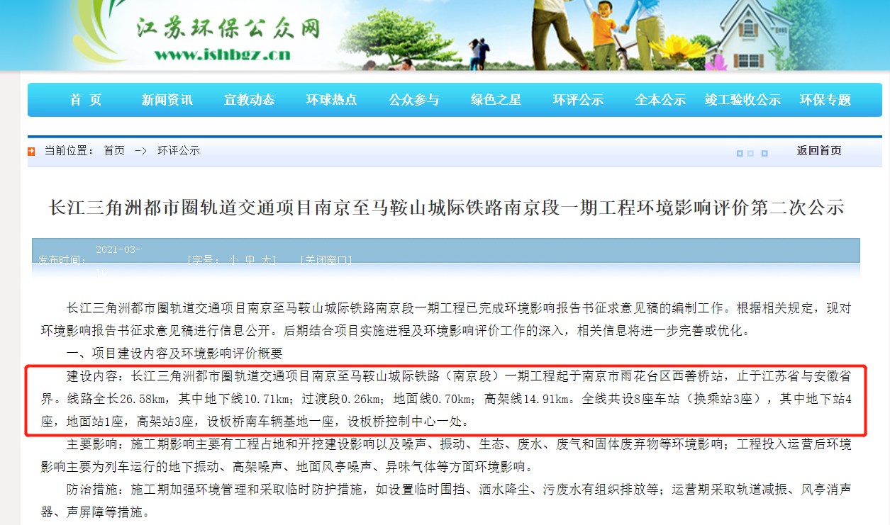 3月10日,江苏环保公众网发布了宁马城际一期环评第二次公示。