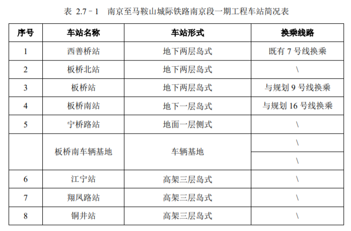 宁马城际一期工程起于南京市雨花台区西善桥站,止于江苏省与安徽省界。线路全长26.58km,其中地下线10.71km;过渡段0.26km;地面线0.70km;高架线14.91km。全线共设8座车站(换乘站3座),其中地下站4座,地面站1座,高架站3座,设板桥南车辆基地一座,设板桥控制中心一处。