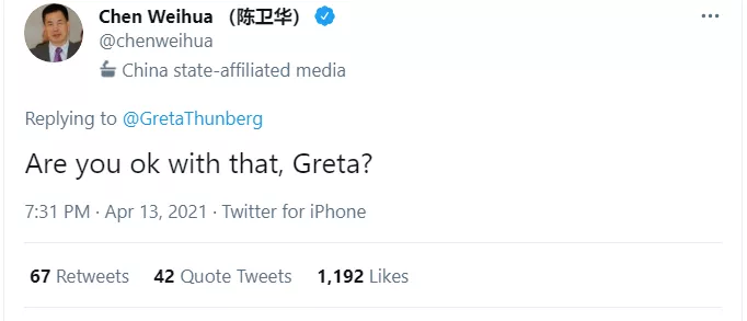 在桑伯格相关推文的评论区,许多网民都对她模棱两可的态度表示失望。中国日报欧盟分社社长陈卫华在评论区反问桑伯格:“你觉得这事能接受吗,格雷塔?”该评论获得了大量网民的点赞支持,许多评论也以此追问桑伯格为何对日本此举如此“沉默”。