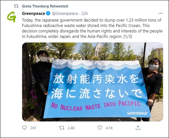 在推文中,桑伯格转发了半岛电视台新闻网对此事的报道,但她的转发语选取了该新闻的第一段,大意是介绍了日本排放核废水的计划和总量。除了这条摘抄的推文,她还转发了著名环保倡议组织“绿色和平”对日本政府的批评。