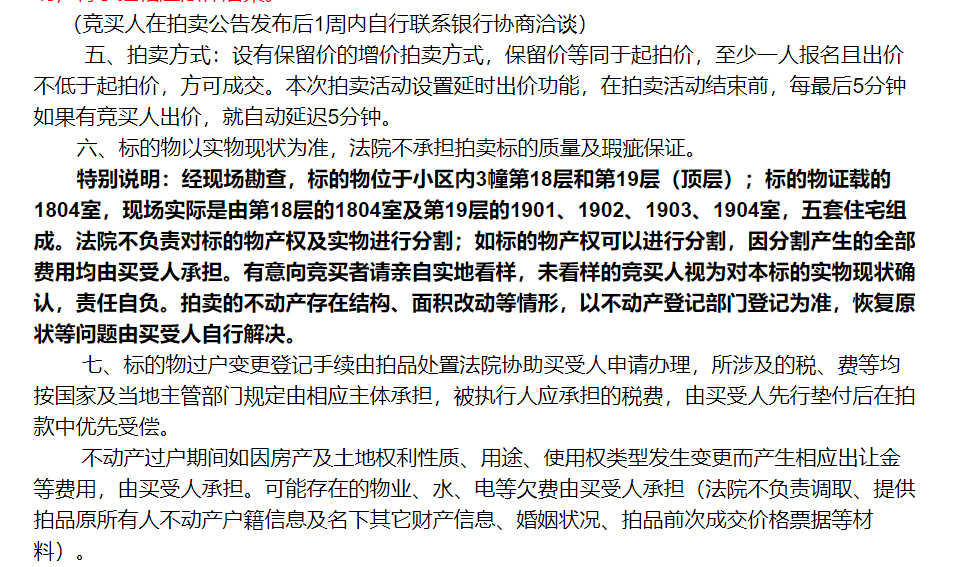 据阿里法拍页面显示,拍品为清江花苑嘉和园3幢1804室,由第18层的1804室及第19层的1901、1902、1903、1904室,五套住宅组成,建筑面积595.90㎡,套内面积498.70㎡,建筑年代2003年,结构为钢混。