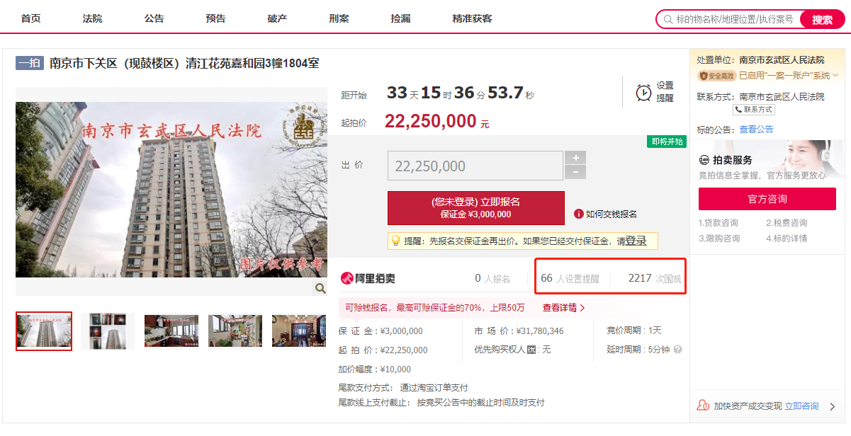 该套房屋起拍价2225万,起拍单价约3.7万/㎡,市场评估价约3178万,相当于打了7折!竞买人需交保证金300万元,竞拍增价幅度为1万元,该套房屋将于2021年4月22日10时起拍。目前,该房屋有人居住,拍卖成交后法院负责交付标的实物。
