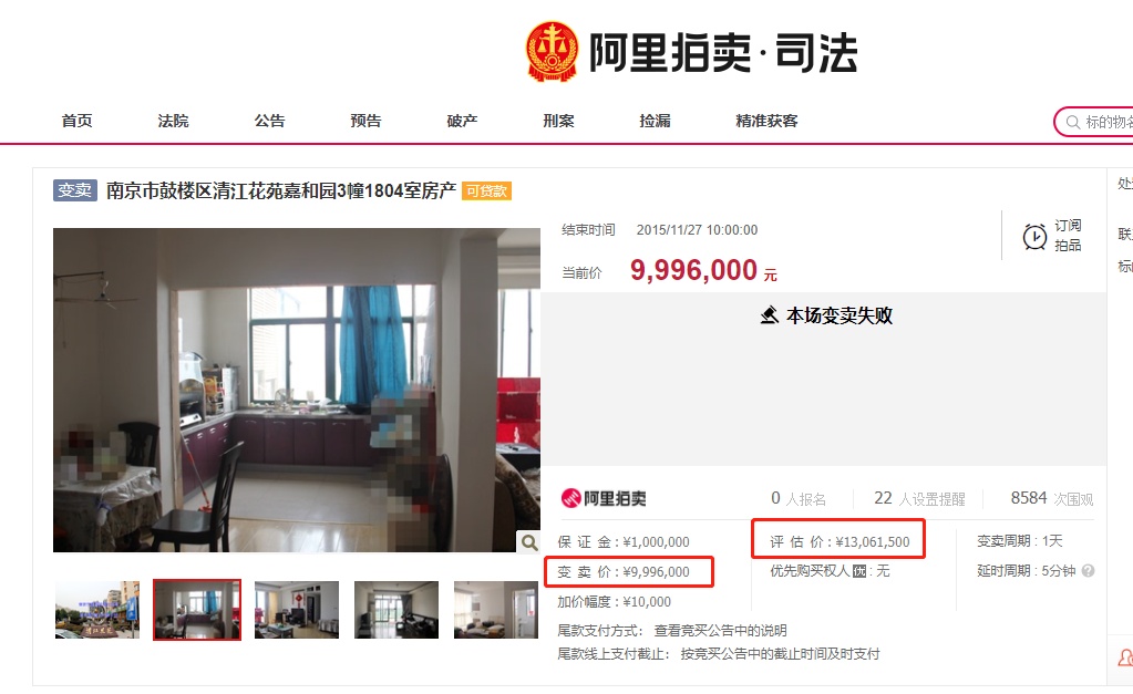 据阿里法拍页面显示,2015年,该房屋就被拍卖,当时的评估总价为1306万元,起拍价从1306万元一度降到999.6万,最终还是流拍了!