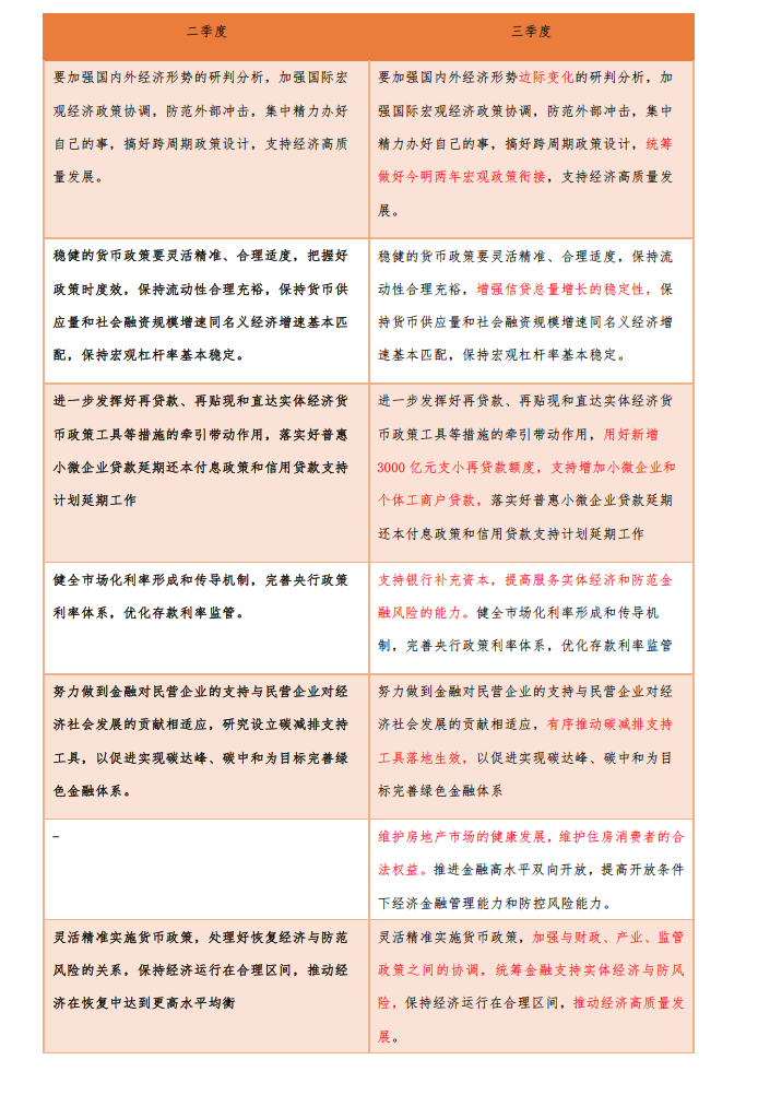 关于货币政策的表述,与二季度相比进行了一些微调,比如新增“用好新增3000亿元支小再贷款额度,支持增加小微企业和个体工商户贷款”等。
