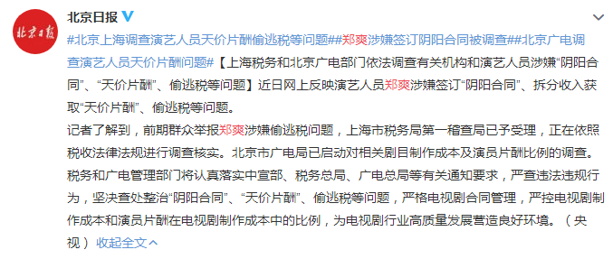 张恒微博发文爆料,郑爽拍摄某部戏时,77天时间入账1.6亿。付款方式走的阴阳合同,4800万的纯片酬,剩下的1.12亿,以公司增资的形式打给了爽妈控股的公司。据最新消息,上海税务和北京广电部门已经启动调查有关机构和演艺人员涉嫌“阴阳合同”、“天价片酬”、偷逃税等问题。