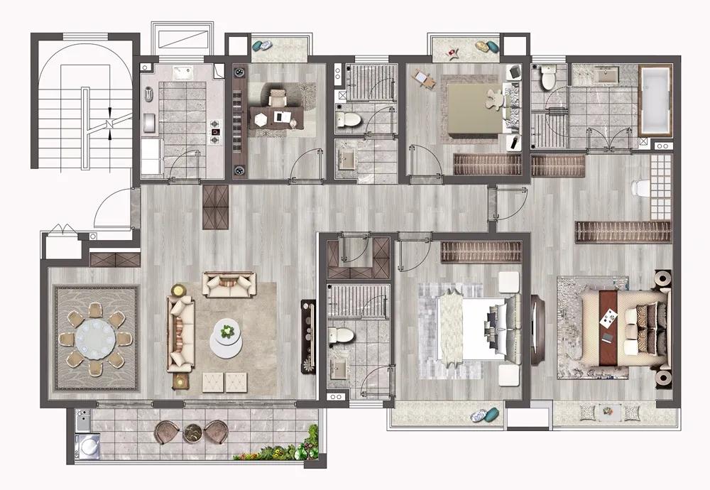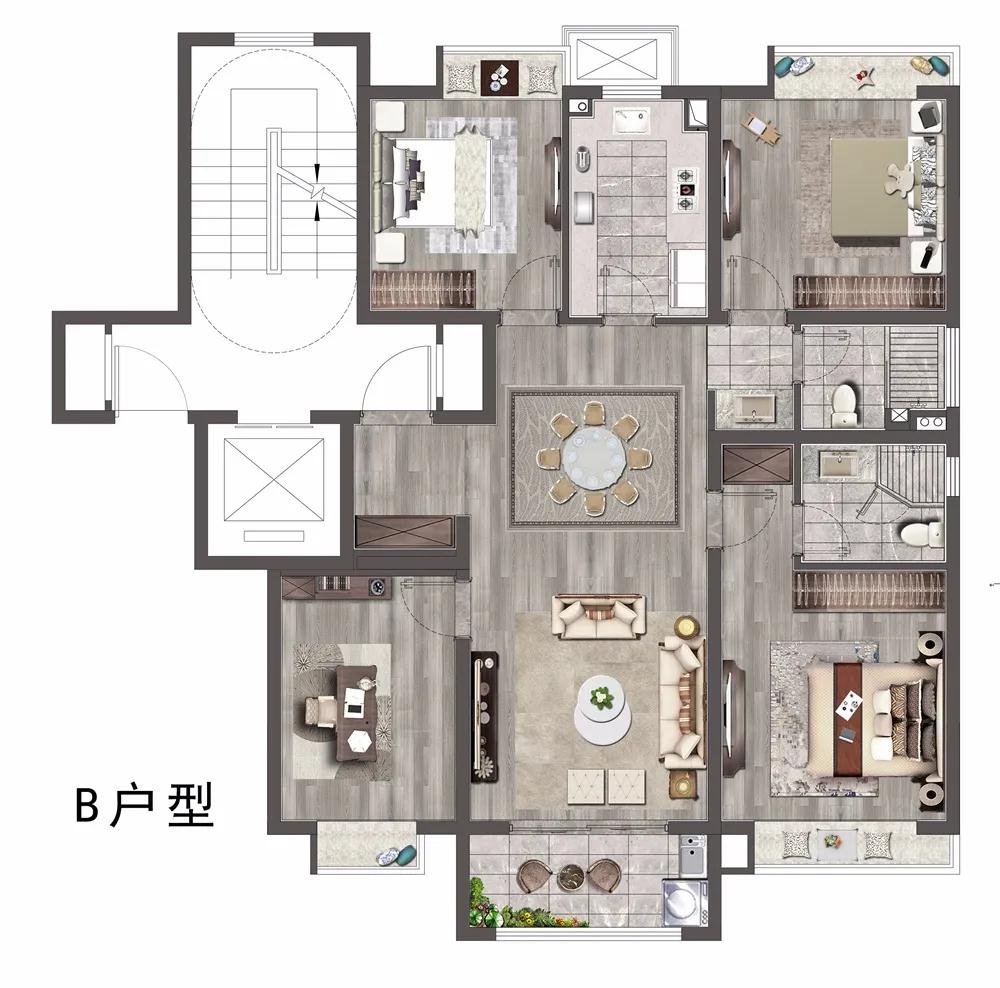 半山云邸B户型:户型建面约123㎡,该户型也有独立入户玄关,设计有三开间朝南,采光较好;四卧分离,主卧带独卫,私密性佳。