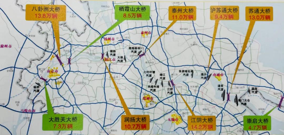 沪苏通大桥通车后,苏通大桥、江阴大桥限行的黄牌货车将会转移至沪苏通大桥过江,预计沪苏通大桥平均流量将达9万辆次;泰州大桥平均流量预计仍超10万辆次。