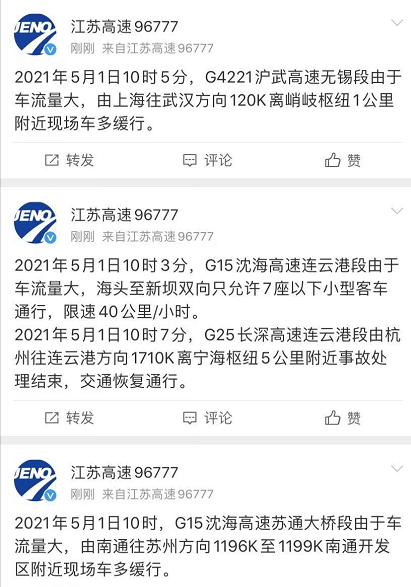 据江苏高速最新消息,目前多条道路车流量大,限速、车多缓行。