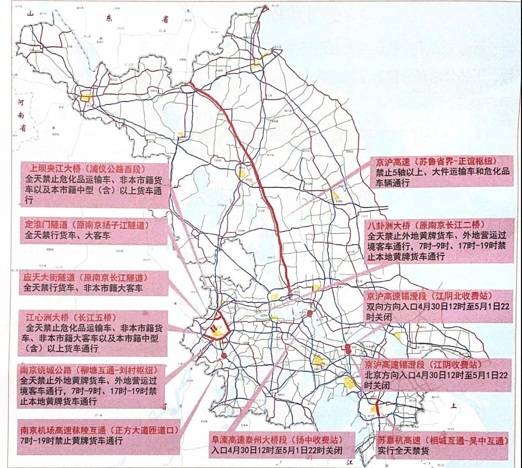 五一期间,八卦洲大桥、江阴大桥、苏通大桥、崇启大桥继续实施黄牌货车限时错峰出行政策,其中危险化学品运输车全路网、全时段限行,黄牌货车4月30日12:00-1日22:00,4日、5日每日8:00-22:00限行。