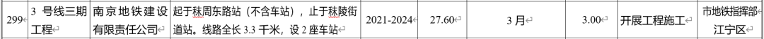 3号线三期新建段由秣周东路站接出,向南至秣陵街道站,设2座地下站(暂定“和风路站、秣陵街道站”),全长3.3km。据《南京市2021年经济社会发展重大项目计划》通知,该工程计划于今年3月开工至2024年建成,通车后秣陵街道附近的居民出行将更加便利。
