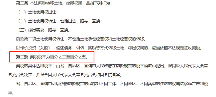我国早在1950年就开征了契税,现行的是1997年出台的《中华人民共和国契税暂行条例》,这一条例明确契税税率为3%-5%,新法并未调整契税税率。