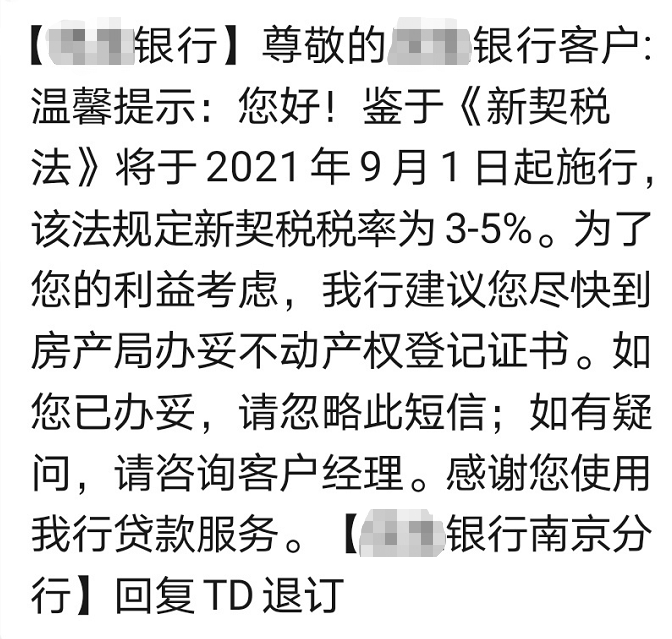 近期西祠网友收到短信,短信称:“鉴于《新契税法》将于2021年9月1日起施行,该法定新契税税率为3-5%。为了您的利益考虑,我行建议尽快办理不动产权登记证书。”