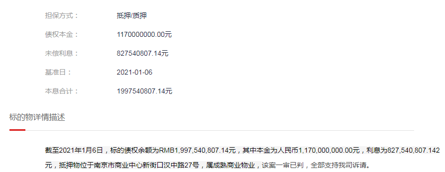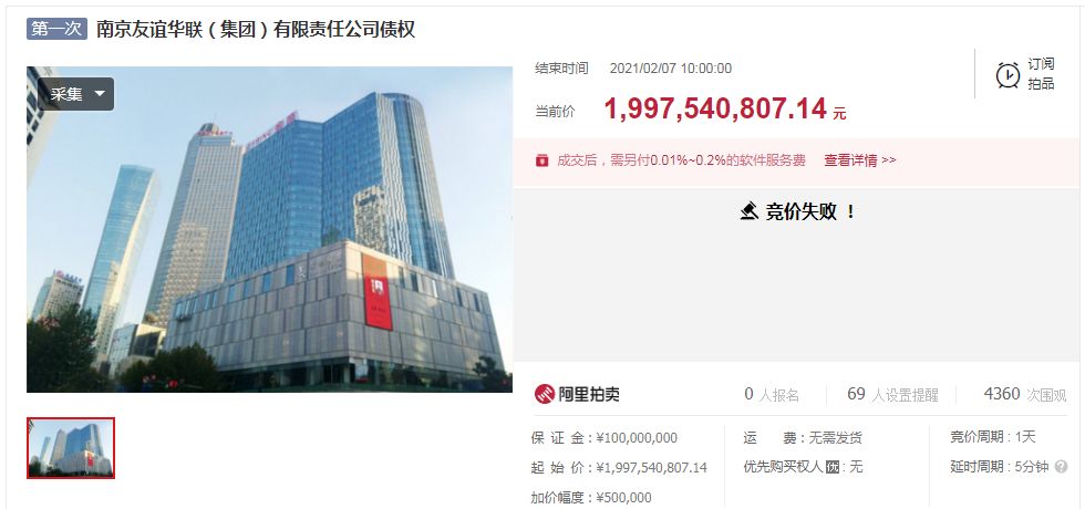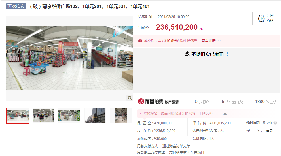 2月,南京华侨广场二次流拍,本次拍卖标的物为浦口区大桥北路1号华侨广场102、1单元201、1单元301、1单元401室房屋,起拍价2.36亿元。