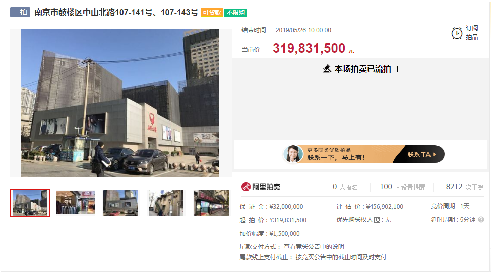 今年2月,溧水老牌商场——金宝市场流拍,起拍价超1.2亿。根据阿里拍卖平台信息显示,金宝市场的市场评估价 21603.39 万元,此次拍卖价格为 1.2亿元,属于打折拍卖。