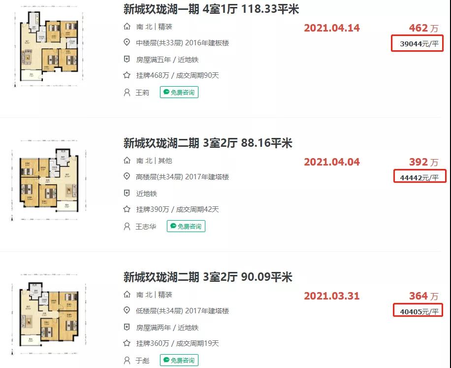 这5个小区的挂牌均价都在4万/㎡左右,不过,距离5万/㎡还有一定距离。