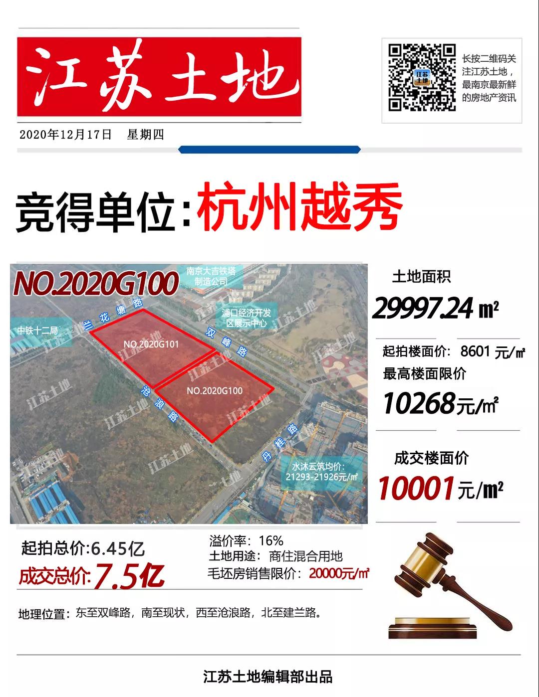 去年12月,江北桥林G100地块,经22轮竞价被杭州越秀以总价7.5亿元竞得,成交楼面价10001元/㎡,溢价率16%。未来毛坯房销售限价为20000元/㎡。