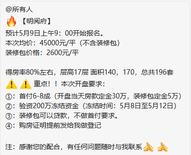 南部新城明阅府即将开盘,预计5月9日上午开始报名,预计此次开盘将加推两栋14-17层的高层房源,共196套房源。放风价4.5万元/㎡,可另选2600元/㎡的升级装修包,验资200万,首付6-8成。