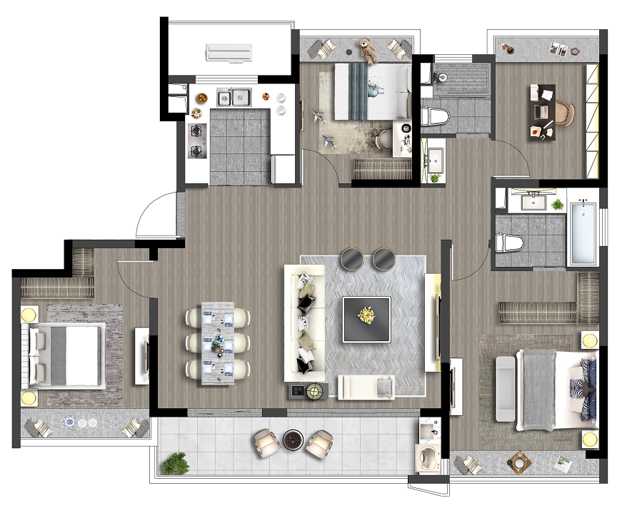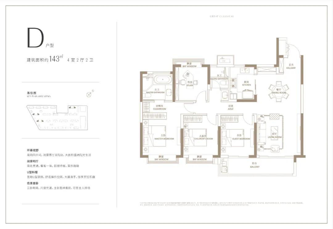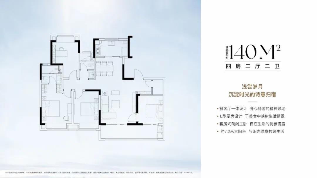 建面约139㎡:云玺四房朝南四开间,约7m大面宽横厅,广角阳台+双飘窗配置