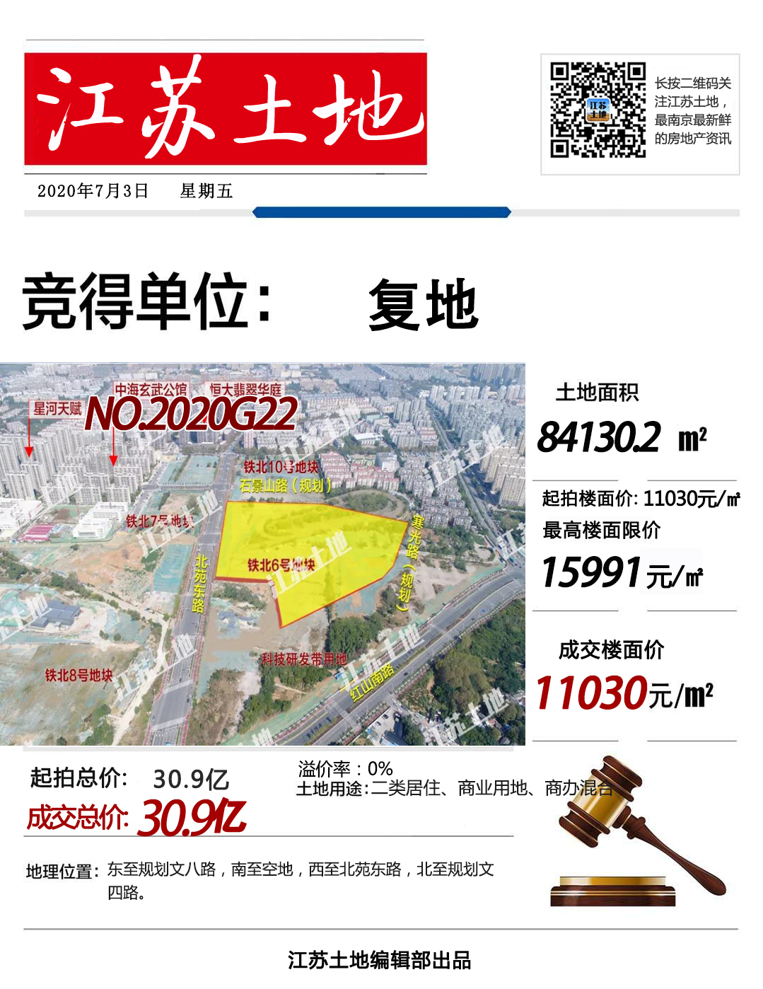 去年7月,复地以底价以30.9亿元摘得城北G22地块,成交楼面价11030元/㎡。