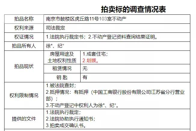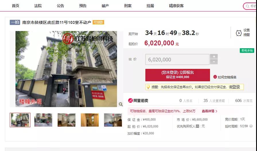 位于南京市鼓楼区虎丘路11号的一套房屋将被法拍,起拍价602万元,市场评估价860万,参与竞拍需缴纳保证金40万元,增价幅度为2万元。
