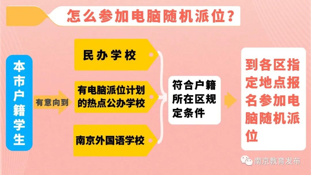 答:有意向到民办学校、有电脑派位计划的热点公办学校、南京外国语学校就读的本市户籍学生,如符合户籍所在区规定条件,可到各区指定地点报名参加电脑随机派位。电脑随机派位志愿须符合本人户籍和学校招生范围相关规定。幼升小的学生可在民办小学、热点公办小学中最多选2所报名,小升初的学生可在民办初中、热点公办初中和南京外国语学校中最多选2所报名。报名后,学生如果被电脑随机派中(报名人数小于招生计划数时,报名的学生视同派中),需在6月27日-7月7日期间到学校现场确认,完成后续相关手续,截止时间为7月7日17:00,逾期未到现场确认的,视为放弃。如果被2所学校同时派中,则需明确选择其中1所学校。