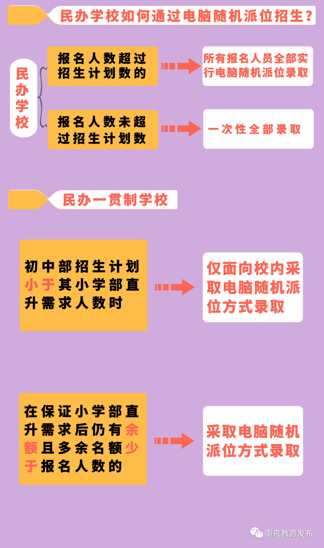 据悉,公办学校采取登记入学或书面通知入学,继续推行热点公办学校空余学额电脑派位入学办法。民办学校报名人数超过招生计划数的,所有报名人员全部实行电脑随机派位录取;报名人数未超过招生计划数的,一次性全部录取。民办一贯制学校初中部招生计划小于其小学部直升需求人数时,仅面向校内采取电脑随机派位方式录取;在保证小学部直升需求后仍有余额且多余名额少于报名人数的,也要采取电脑随机派位方式录取。