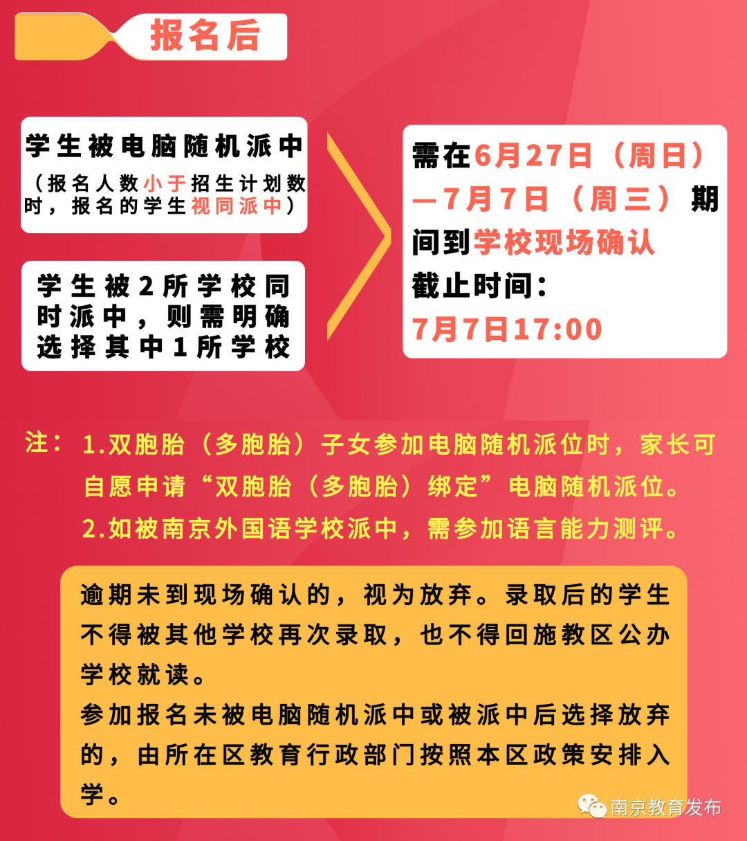 其他与往年一致,有意向到民办学校、有电脑派位计划的热点公办学校、南京外国语学校就读的本市户籍学生,如符合户籍所在区规定条件,可到各区指定地点报名参加电脑随机派位。电脑随机派位志愿须符合本人户籍和学校招生范围相关规定。幼升小的学生可在民办小学、热点公办小学中最多选2所报名,小升初的学生可在民办初中、热点公办初中和南京外国语学校中最多选2所报名。报名后,学生如果被电脑随机派中(报名人数小于招生计划数时,报名的学生视同派中),需在6月27日-7月7日17:00期间到学校现场确认,完成后续相关手续。如果被2所学校同时派中,则需明确选择其中1所学校。教育部门特别提醒,逾期未到现场确认的,视为放弃。被电脑派中,并到派中学校现场确认录取后的学生不得被其他学校再次录取,也不得回施教区公办学校就读。