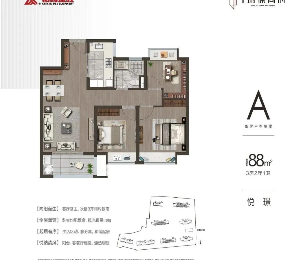 项目总占地面积约35000㎡ ,总建筑面积约131252.72㎡ ,小区容积率约为2.5,规划了8栋住宅,包含2栋洋房和6栋高层,共计848套房源。