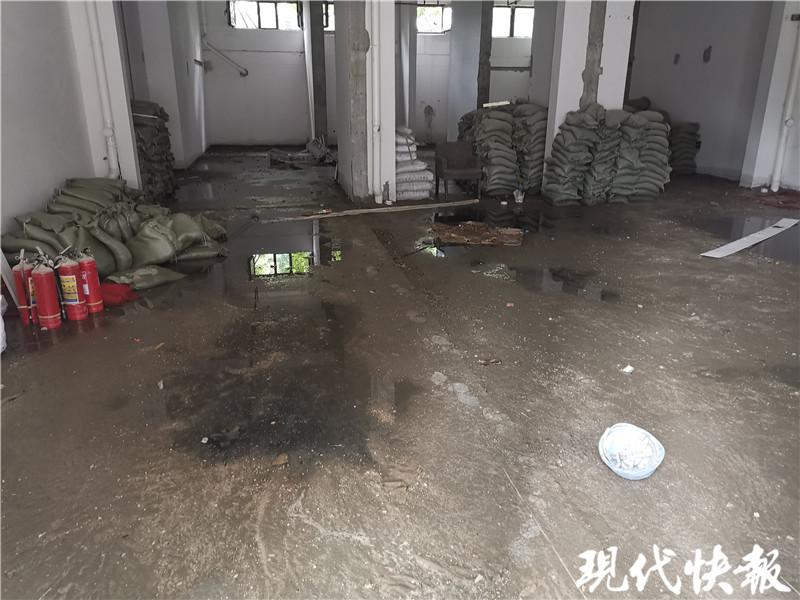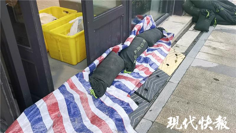 让窦先生烦恼的是,在他的商铺里,不光有雨水,还有很多泛上来的粪便。现代快报在现场看到,窦先生的商铺隔壁是一个超市,超市门口垒起了几十个防汛专用沙袋,超市内部的墙面上有大面积的水渍。