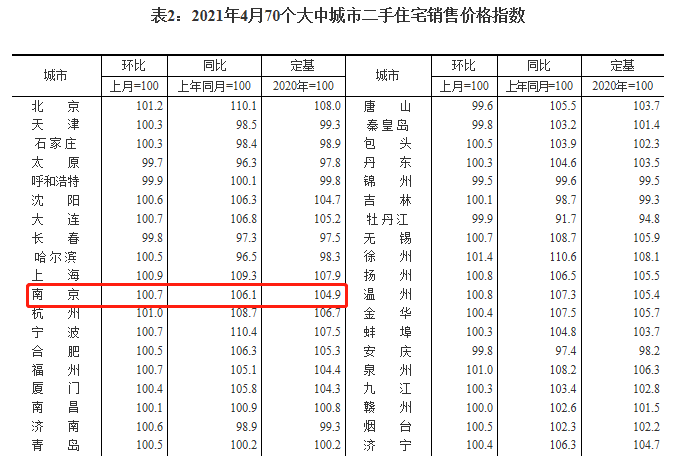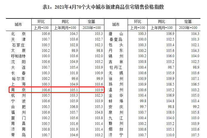 今天(5月17日)上午,国家统计局最新发布了2021年4月份70个大中城市商品住宅销售价格变动情况统计数据。其中,4月南京新房价格环比上涨0.6%、同比上涨5.1%,二手房价格环比上涨0.7%、同比上涨6.1%。