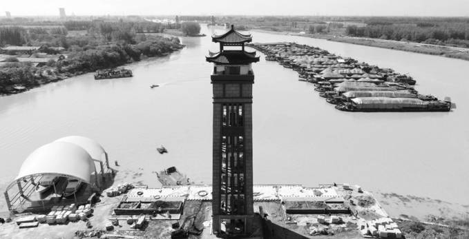 2021年5月17日拍摄的位于淮安京杭大运河与里运河交汇处的航标塔。据了解,该航标塔共9层、36米,2020年10月投入建设,预计2021年5月底投入使用,是推进京杭运河(淮安段)绿色现代航运建设的重要项目,建成后将是京杭大运河上标志性建筑之一。