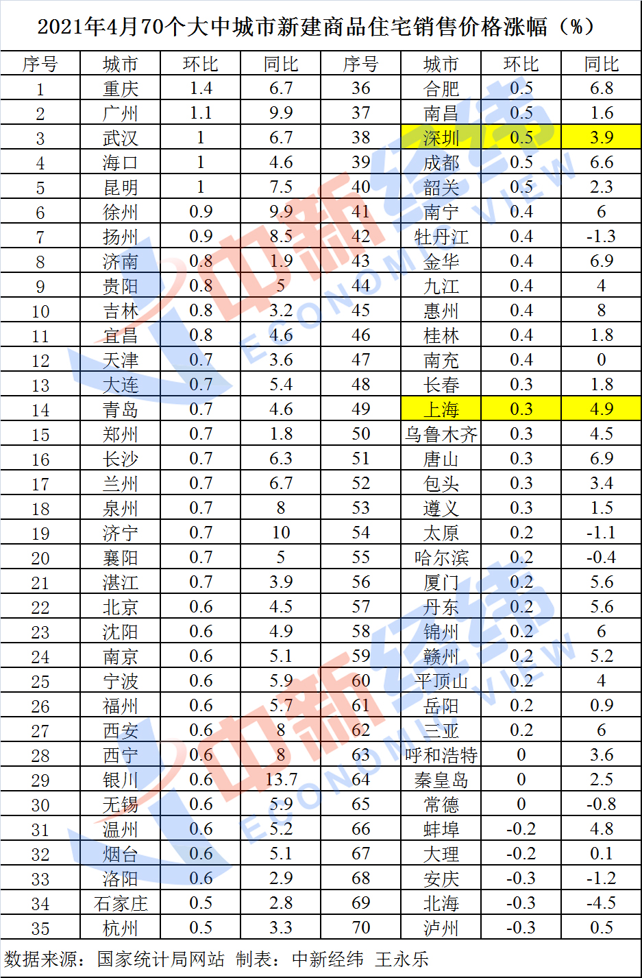 中原地产首席分析师张大伟预计,上半年房价上涨趋势依然持续,但越来越收紧加码的调控政策有望平稳市场。包括深圳、上海开始强监管二手房价格、经营贷,后续市场有望逐渐平稳。70城数据显示,上海、深圳4月新房价格环比涨幅排名淡出前30。
