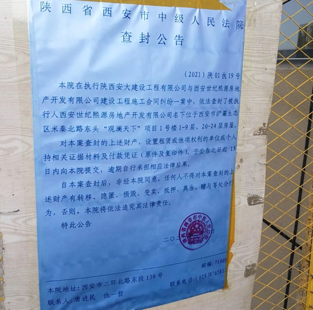 2021年2月3日,西安市中级人民法院发出查封公告,因执行此前承建商与世纪熙源的合同纠纷,依法查封了1#楼1-9层与20-24层房屋。