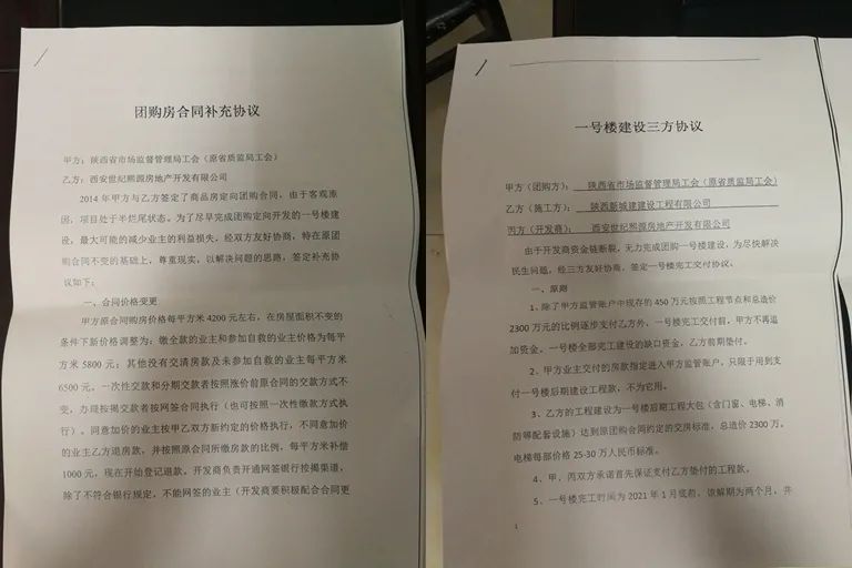 在经过业主方与开发商以及原承建商多轮谈判后,2020年8月,陕西省市场监督管理局工会(原省质监局工会)与世纪熙源签订了《团购房合同补充协议》。接着,陕西省市场监督管理局工会、新城建以及开发商又签订了一份《一号楼建设三方协议》。