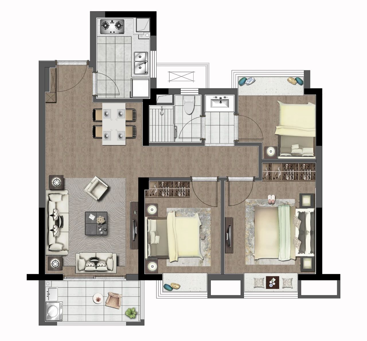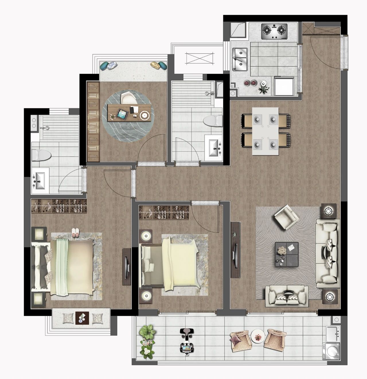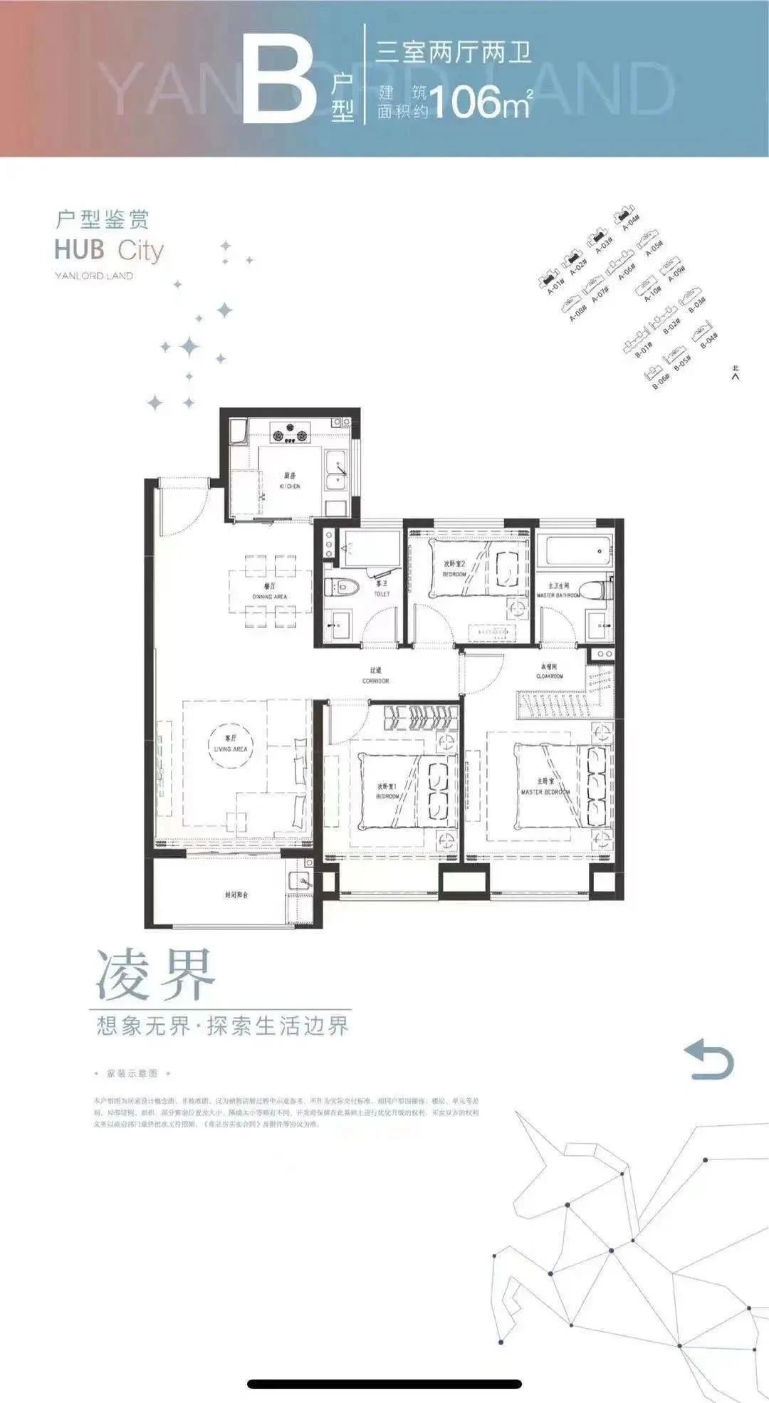建面约107㎡,为三开间朝南的边户,共三房两厅两卫及一个超大南向阳台。U型厨房、卫生间干湿分离,主卧为套间设计,增加了私密感。同时卧室都带内飘窗设计,增加了空间的层次感和空间利用率。