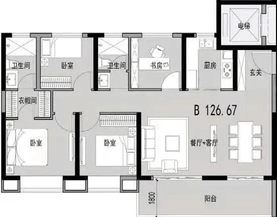 127㎡三房两厅两卫:三开间朝南,南北通透;大横厅设计,共享宽景阳台;入户玄关设计,U型厨房;主卧套间设计,独立卫浴+衣帽间+飘窗