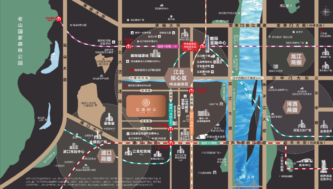花语熙岸府周边拥有3条地铁线,即已通车地铁10号线、11号线(规划中)和13号线(规划中)经过附近,更有D10、512等多条公交线路可供选择;城市干道方面,应天大街长江隧道、定淮门长江隧道以及规划中的汉中西路隧道均在项目周边,交通便捷。