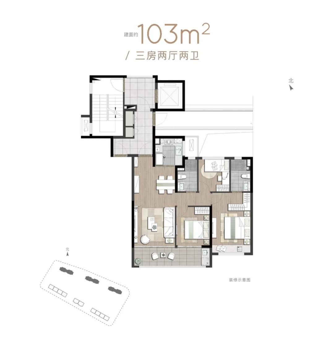 建筑面积约103㎡的三房两厅两卫:三开间朝南,视野开阔。独立玄关,方正餐客厅,约6.3米双面宽景阳台,主卧衣帽间设计。
