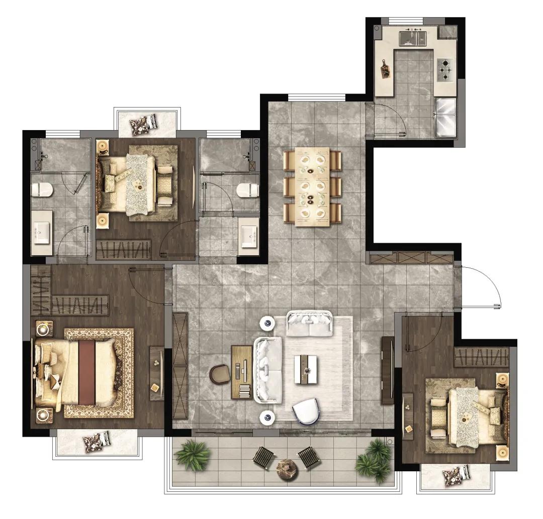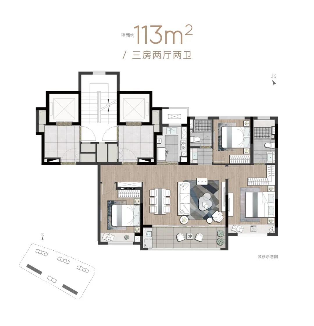 建面约113㎡的三房两厅两卫:四开间朝南,约6米南向横厅,双面宽阳台。套房式主卧配备独立卫浴、瞰景大飘窗、衣帽间。