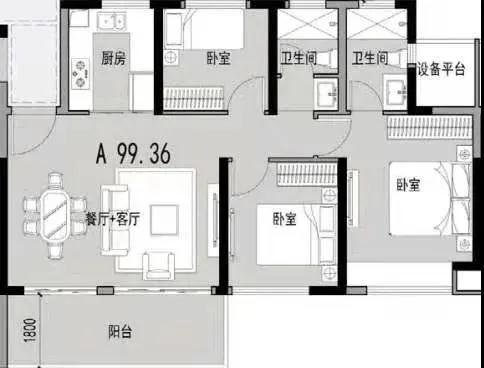 99㎡三房两厅两卫:三开间朝南,南北通透;大横厅设计,格局开阔;U型厨房,正对客餐厅;主卧套间设计,独立卫浴+飘窗;