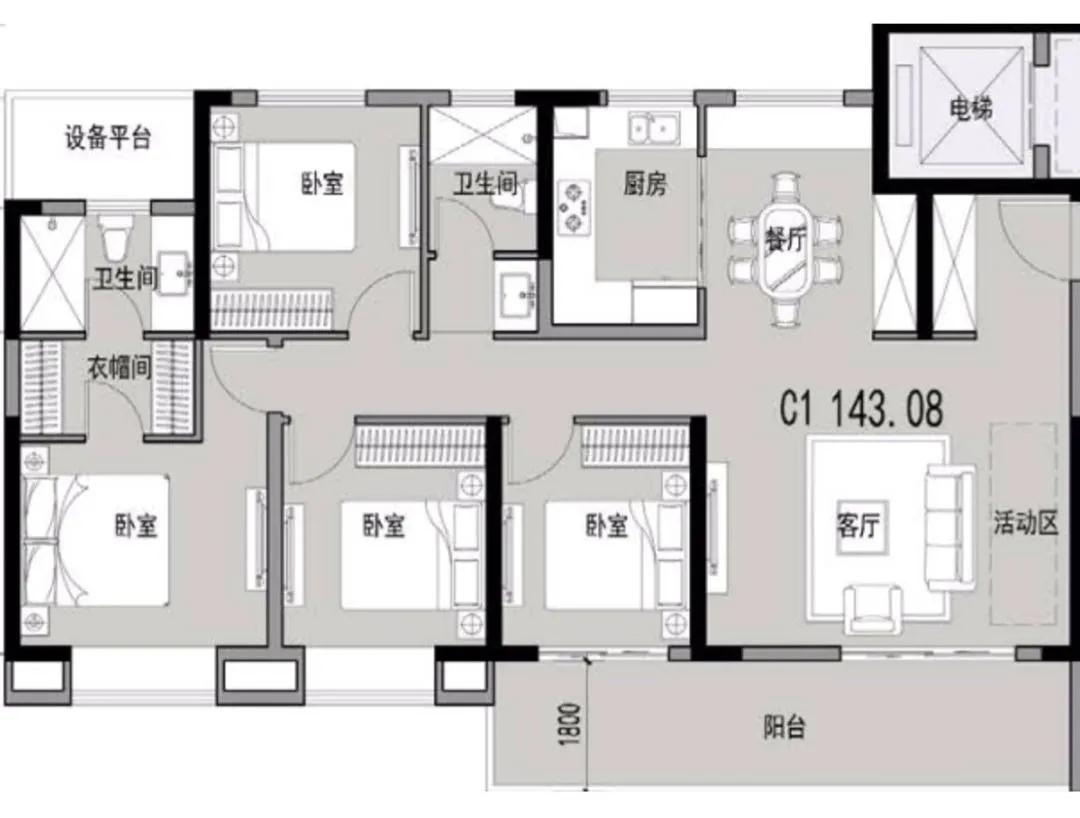 143㎡四房两厅两卫:户型另外有四套190㎡,143上跃,四房三厅三卫,挑高客厅+大面宽观景阳台。