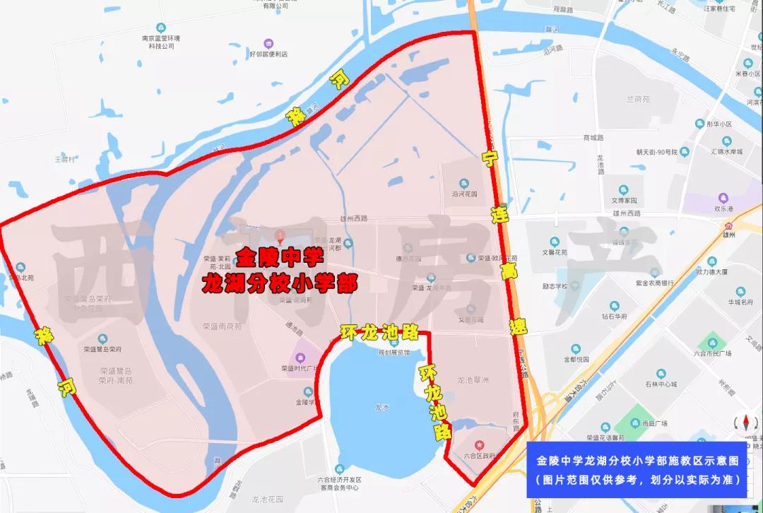 金陵中学龙湖分校小学部:滁河以南,宁连高速—宁六公路以西,通湖路—龙池湖—龙群路—滁河河套南支流以北,滁河以东。