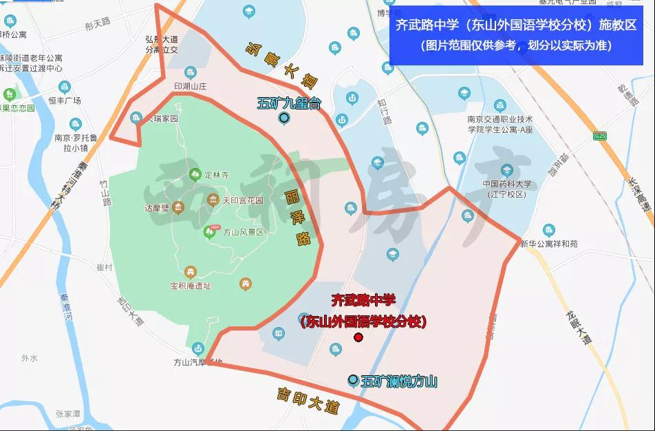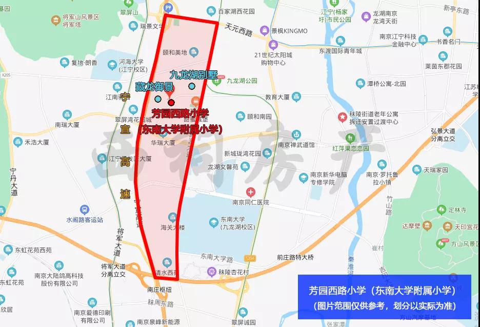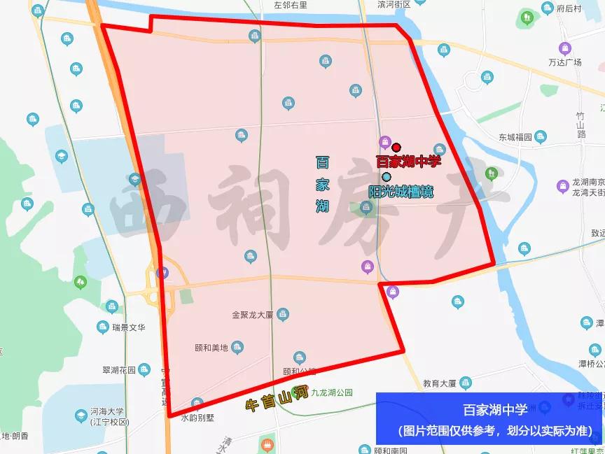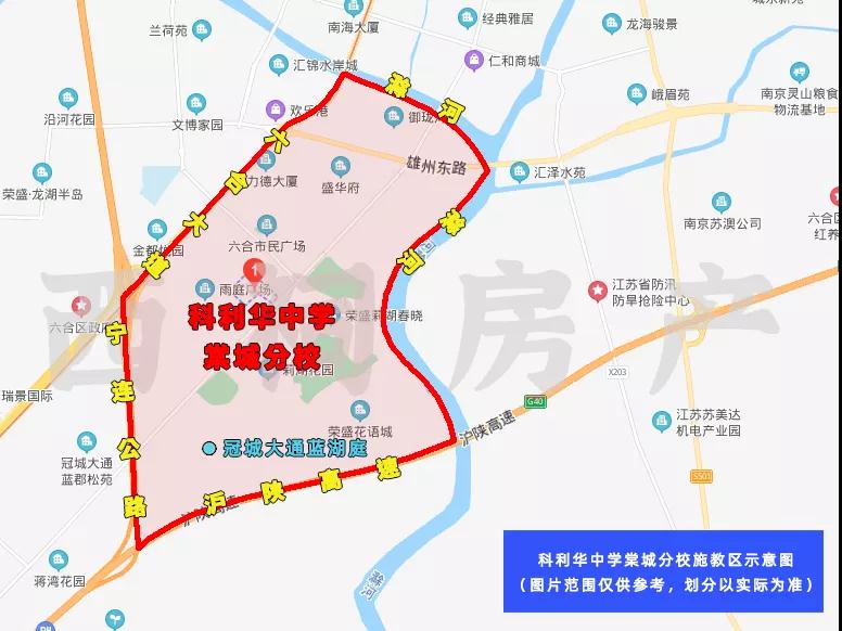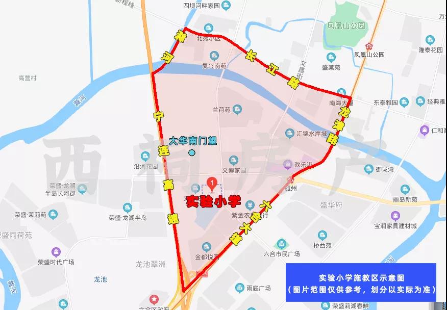 图片金陵中学龙湖分校初中部:招兵桥—长江路以南,龙津路—龙津南路—宁六公路以西,通湖路—龙池湖—龙群路—滁河河套南支流以北,滁河以东。