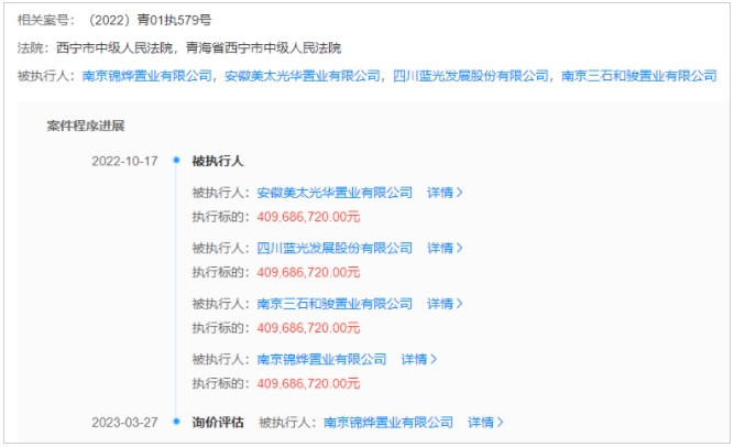 据显示,系蓝光子公司与五矿国际信托有限公司的合同纠纷,蓝光子公司被列为被执行人,执行标的约4亿元,名下资产被青海省西宁市中级人民法院司法拍卖。