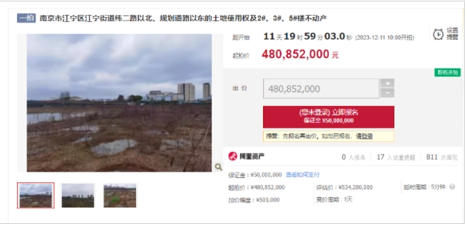 近日,据阿里法拍显示,蓝光江宁滨江G08地块即将被拍卖,该地块起拍价约4.81亿元,评估价约为5.34亿元,竞拍需交纳保证金5000万元,加价幅度为500万,竞拍时间为2023年12月11日10时至2023年12月12日10时止。