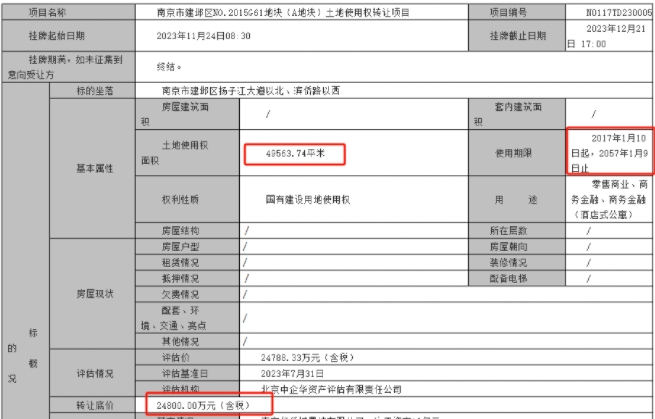 近日,江苏省公共资源交易平台发布了南京市建邺区NO.2015G61地块即华侨城欢乐滨江项目(A地块)土地使用权转让项目公告,华侨城欢乐滨江A地块评估价为2.478833亿元(含税),转让底价为2.48亿元(含税),土地使用权面积为49563.74平米,用途为零售商业、商务金融、商务金融(酒店式公寓)。