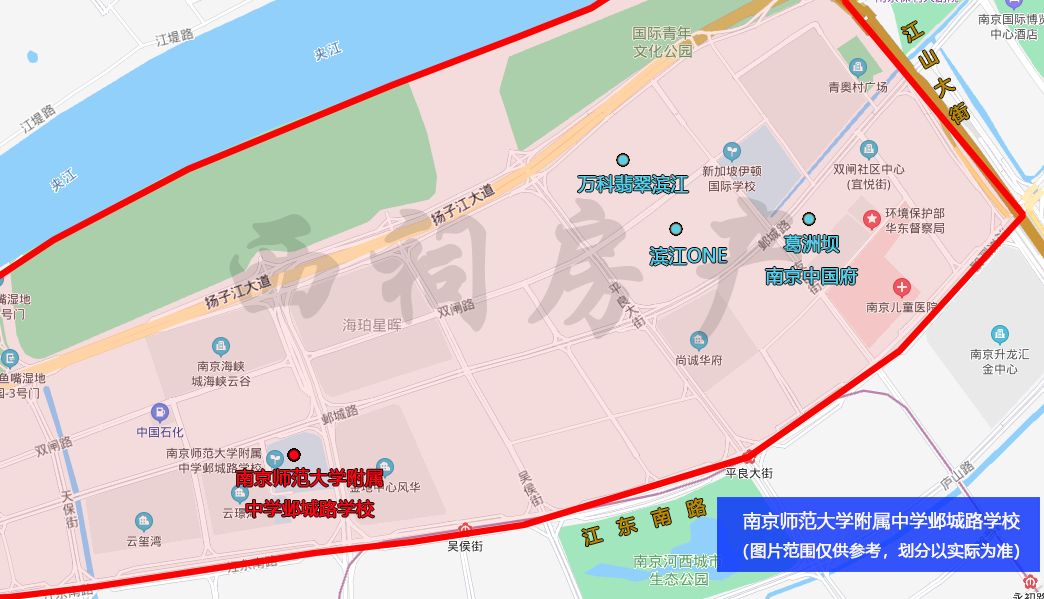 在该施教区范围的小区有:葛洲坝南京中国府、融创滨江one、万科翡翠滨江等