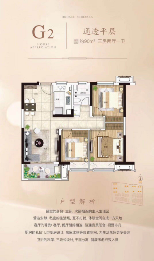 高层建筑面积约90㎡(3房2厅1卫)户型图
