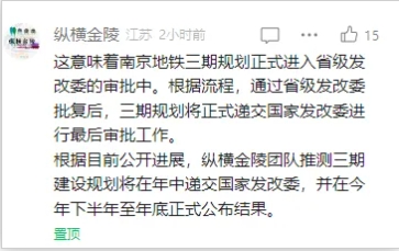 据“纵横金陵”消息,根据流程,通过省级发改委批复后,三期规划将正式递交国家发改委进行最后审批工作。 根据目前公开进展,可以推测三期建设规划将在年中递交国家发改委,并在今年下半年至年底正式公布结果。