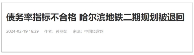 紧接着,省会城市哈尔滨地铁二期规划被退回的消息流出。有网友在人民网“领导留言板”咨询哈尔滨地铁二期规划上报情况,哈尔滨官方回复称,哈尔滨市地铁第二期建设规划于2017年上报至国家发改委待批,但2018年,国务院出台《国务院办公厅关于进一步加强城市轨道交通规划建设管理的意见》(国办发〔2018〕52号文),按该文件规定,哈尔滨市债务率指标不符合审批要求,导致二期建设规划被退回。近些年,由于该指标一直不符合审批要求,国家发改委仍不重新受理哈尔滨市地铁第二期建设规划。